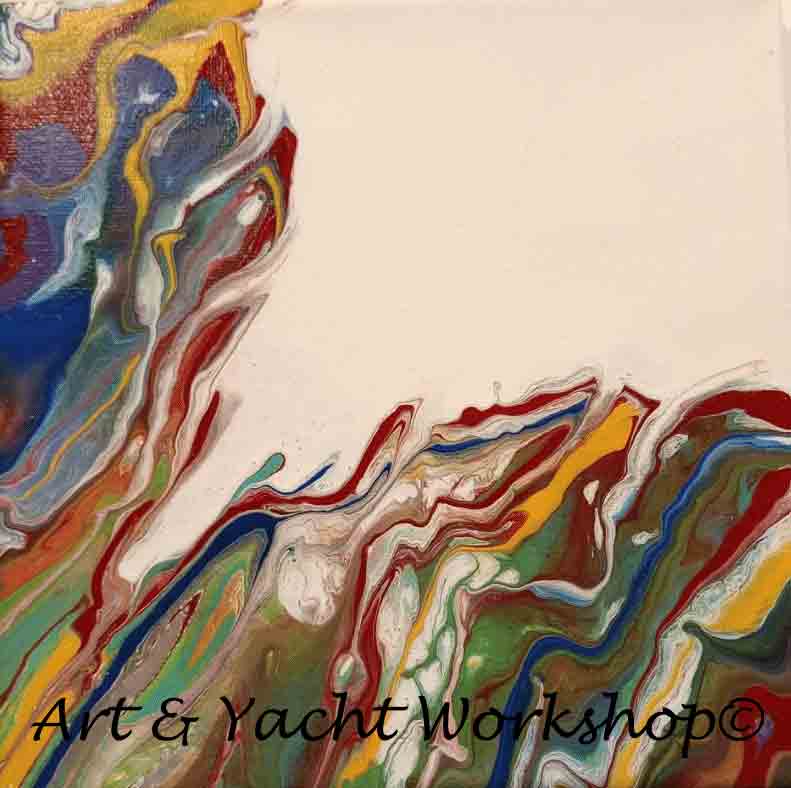 Amsterdam Acrylfarben in modifiziertem, flüssigem Kunstguss, auf gespannter Baumwollleinwand. Technik: Dutch Pour. Veredelt mit zwei Schichten klaren Acryllacks.