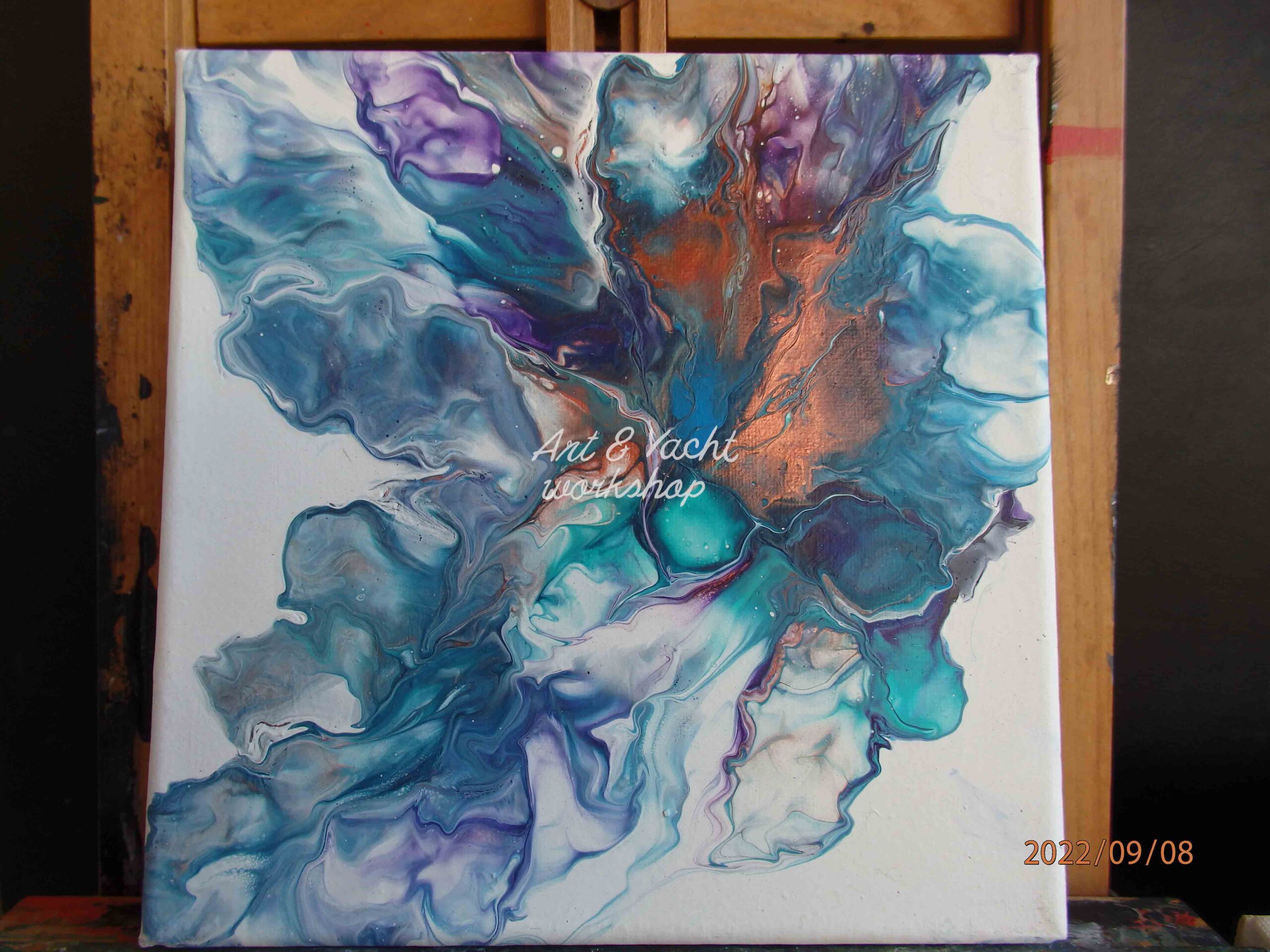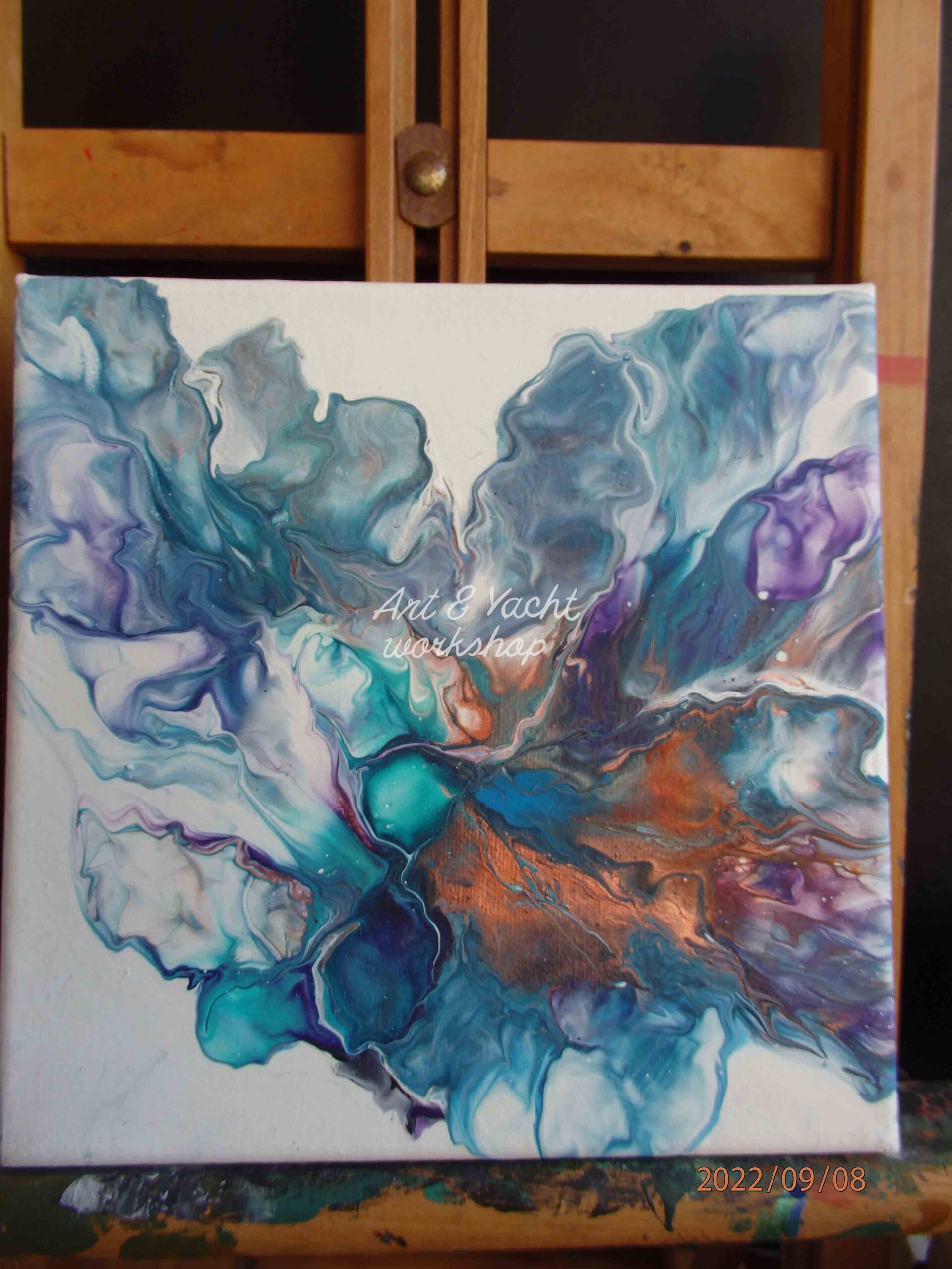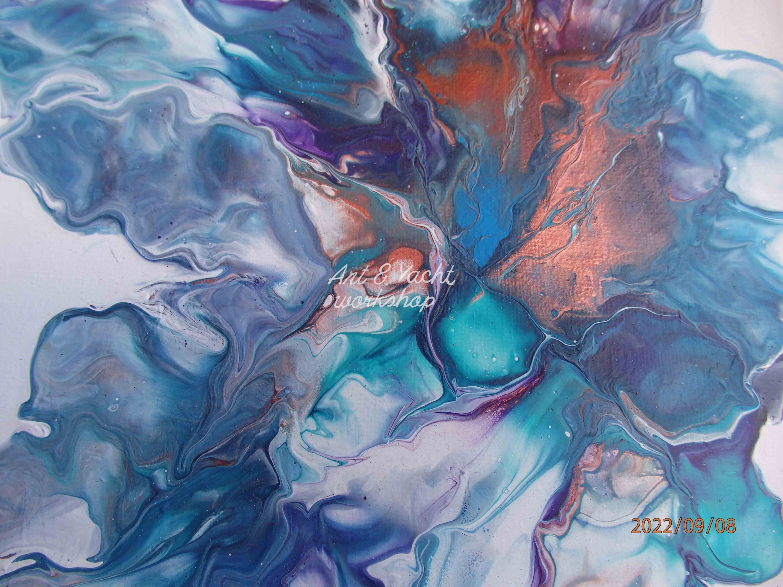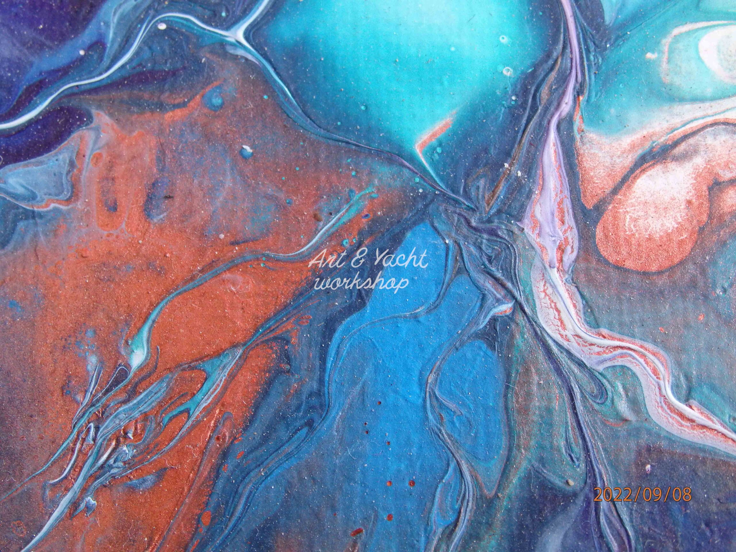 Amsterdam Acrylfarben in modifiziertem, flüssigem Kunstguss, auf gespannter Baumwollleinwand. Technik: Dutch Pour. Veredelt mit zwei Schichten klaren Acryllacks.